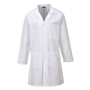 Klasyczny fartuch roboczy wykonany z tkaniny bawełnianej.