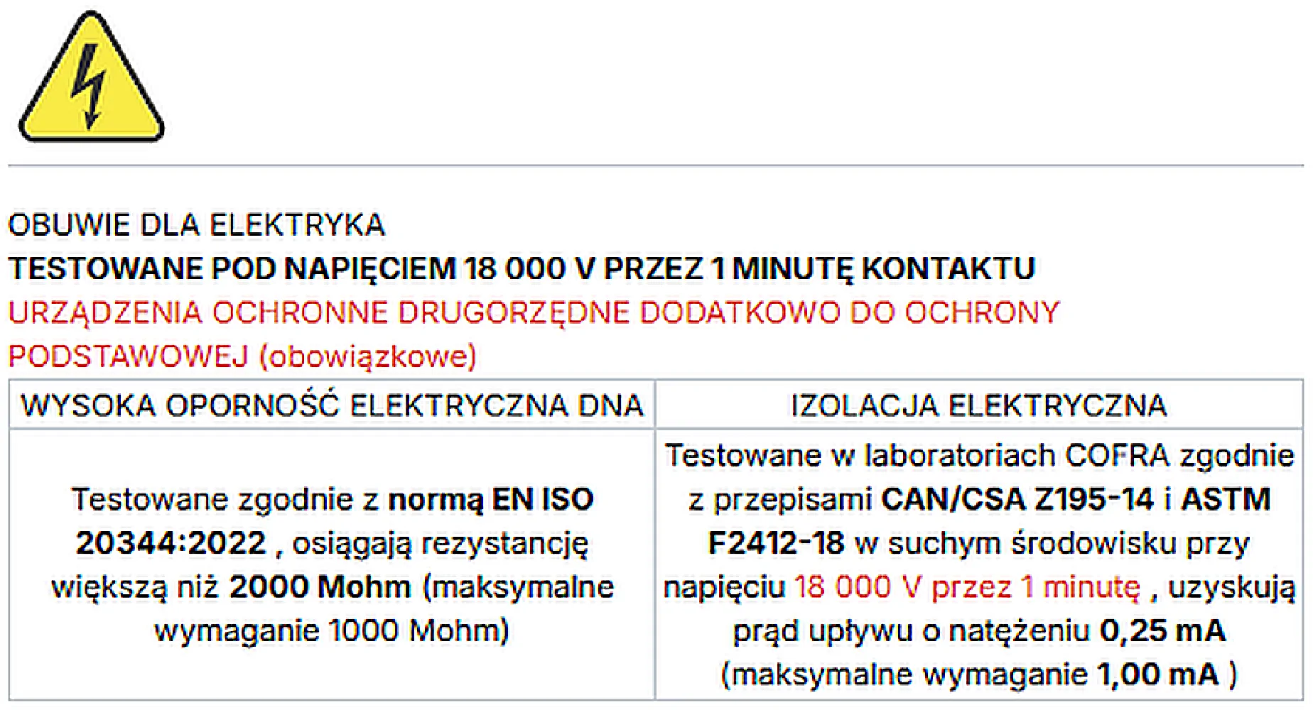 Odporność elektryczna podeszwy 2000MOhm, 18 000 V przez okres 1 minuty na suchym podłożu.